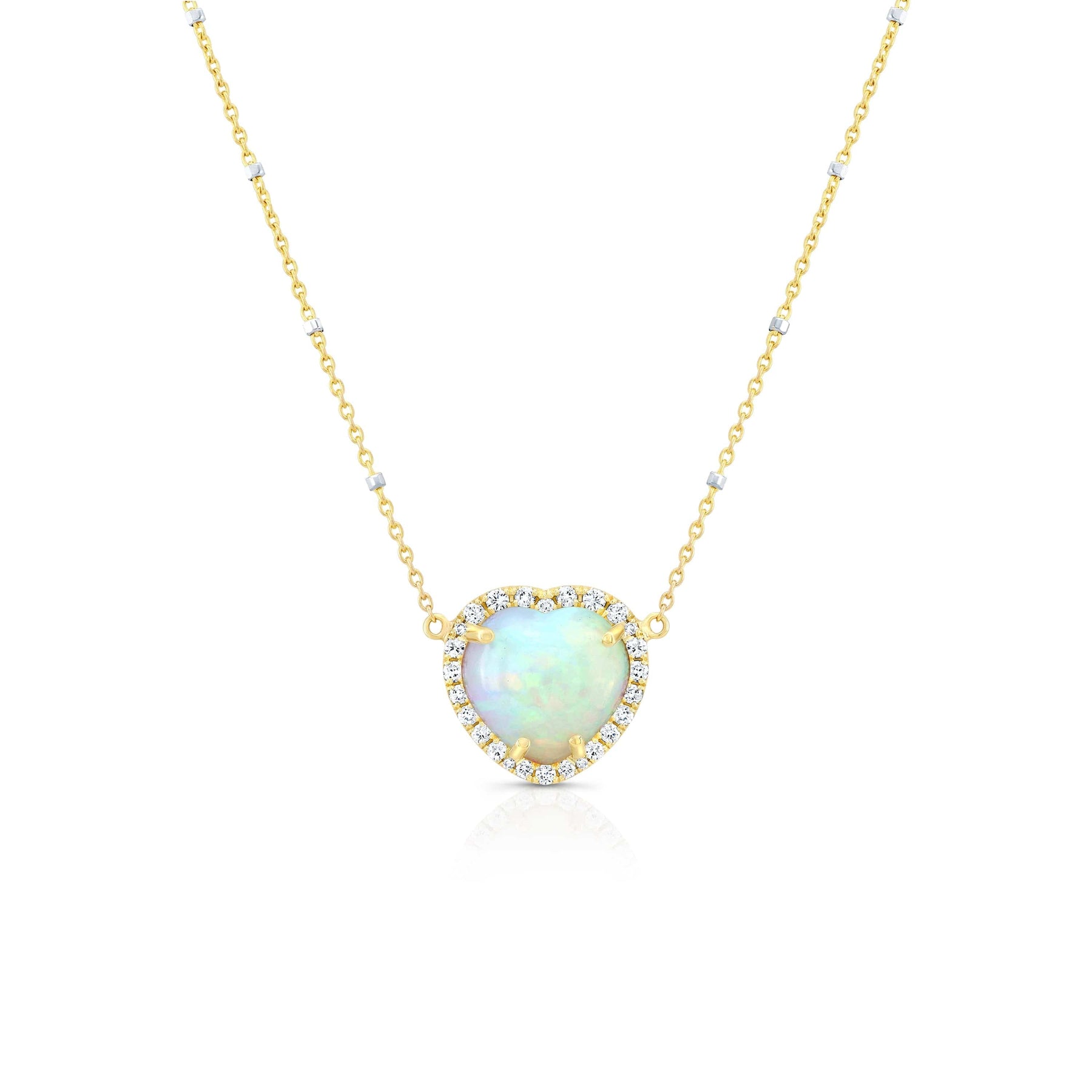 A luminous expression of romance and craftsmanship, the Opal Heart with Diamond Halo Necklace features a glowing 2.4-carat heart-shaped Australian opal framed by a radiant halo of white diamonds. Set in solid 14k gold, the pendant shimmers with natural flashes of color and light. Finished on an adjustable 16"–18" chain, this opal heart necklace is designed for versatile wear—striking on its own or layered. Handcrafted in Los Angeles, each piece reflects exceptional artisan detail and timeless beauty.