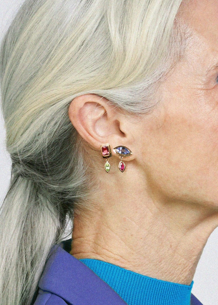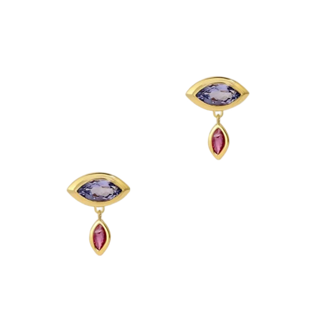 Delicate eye‑shaped studs feature a gold‑framed tanzanite gemstone above a playful ruby accent. Handcrafted in Los Angeles, these earrings combine intuition‑inspired design with refined sparkle. Sold as a pair, they add a subtle yet captivating touch to any look. Perfect for gifting or everyday elegance.