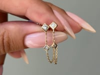 Edgy yet elegant, these diamond chain drop studs bring movement and sparkle to your everyday look. Crafted in polished 14K yellow gold, each earring features two bezel-set princess-cut diamonds connected by a delicate gold chain. The linear silhouette elongates the ear, while the playful chain detail adds a modern twist. Perfect for layering with hoops or wearing solo as a statement, these earrings are where sleek design meets subtle drama.
