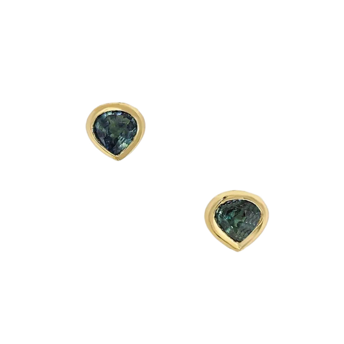 Delicate earrings featuring an exaggerated pear‑cut sapphire that shifts between deep green and dark blue, offering flashes of color as light hits the gem. Handcrafted in Los Angeles and made to order, these studs are sold as a pair.