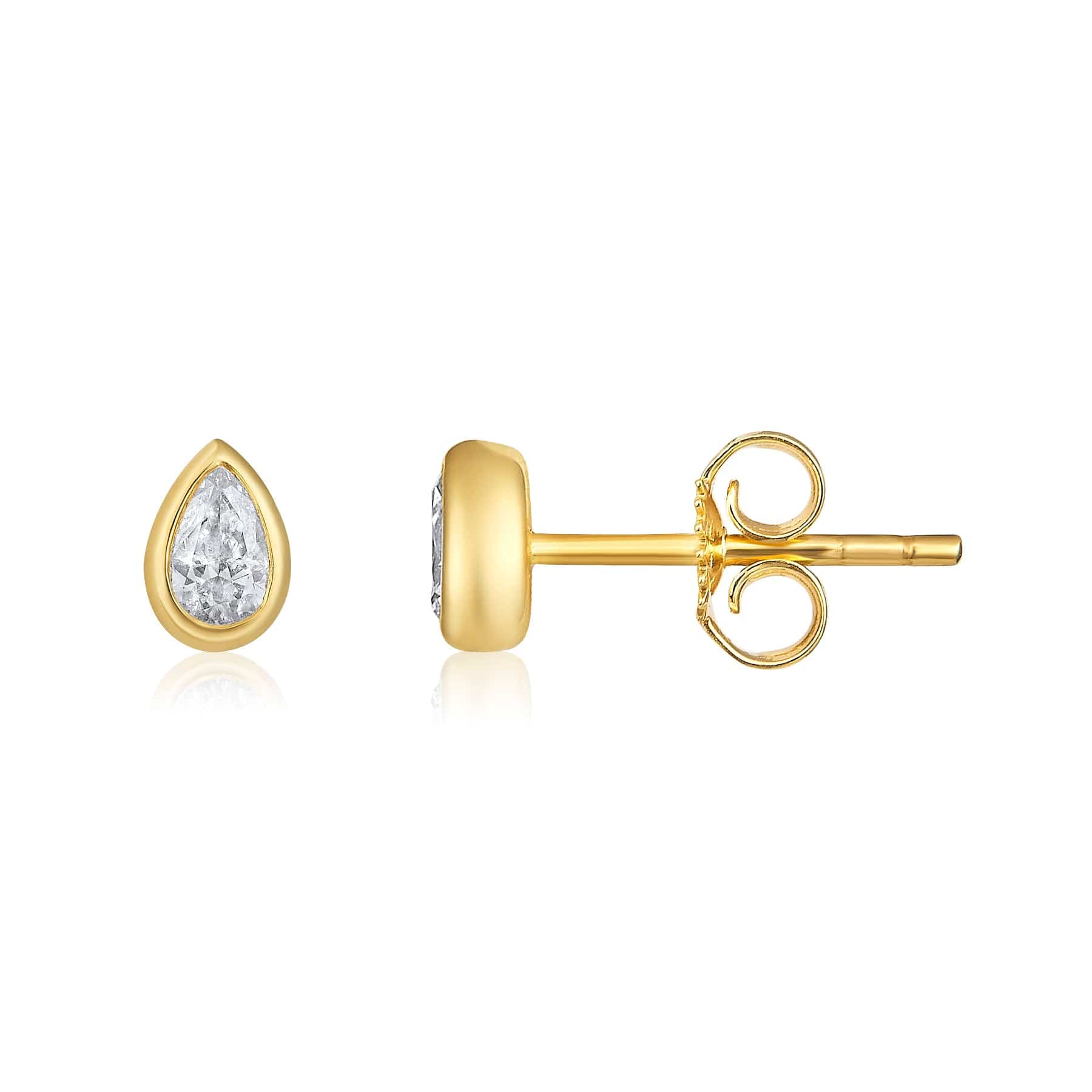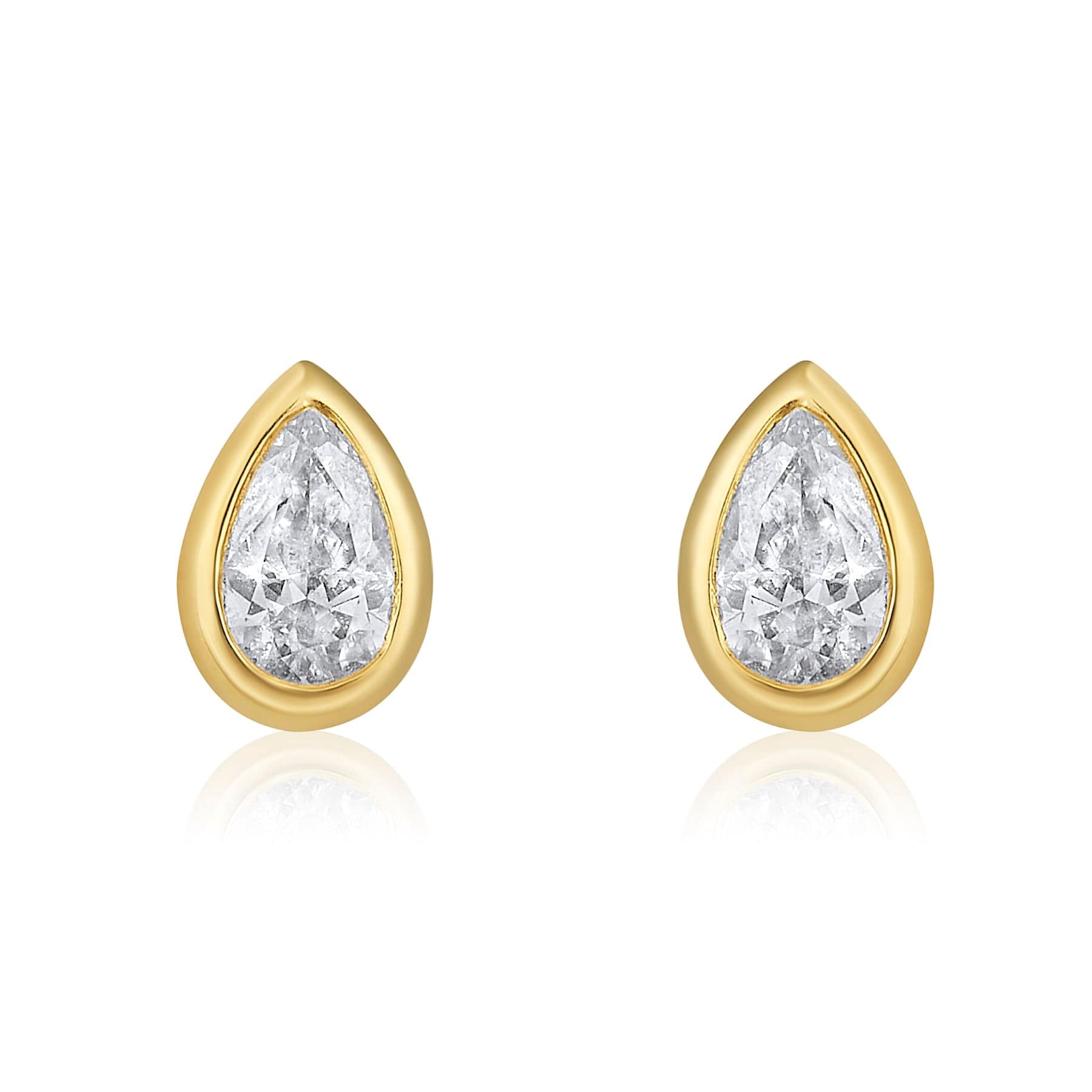 Refined and radiant, these pear bezel studs bring clean lines and everyday elegance. Sculpted in warm 14K yellow gold, each pear-shaped diamond rests in a smooth, low-profile bezel that enhances sparkle while keeping the look minimal and secure.