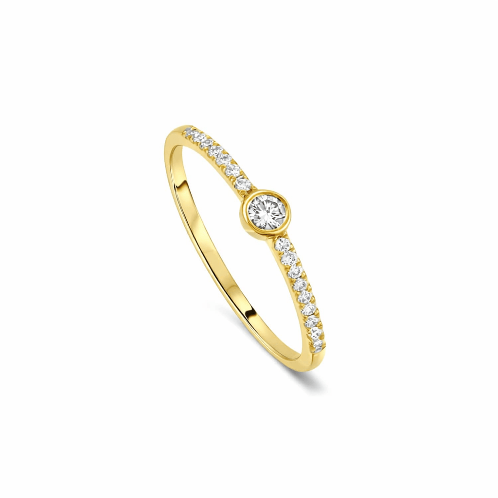 Dainty pave diamond band with one bezel set diamond and prong-set diamonds. Wear alone or stack with multiple rings for maximum sparkle!