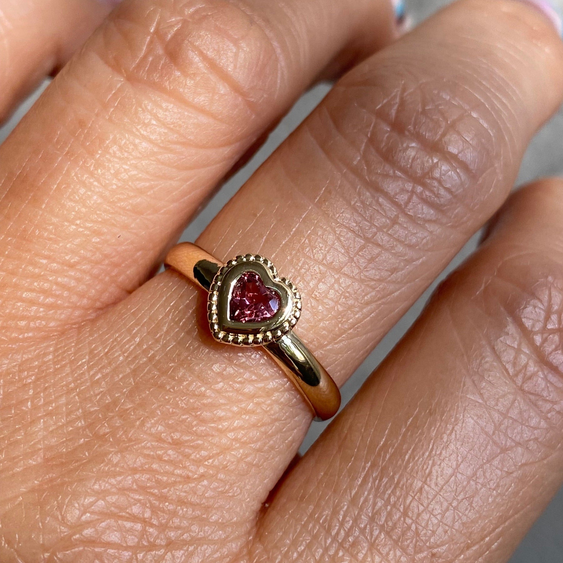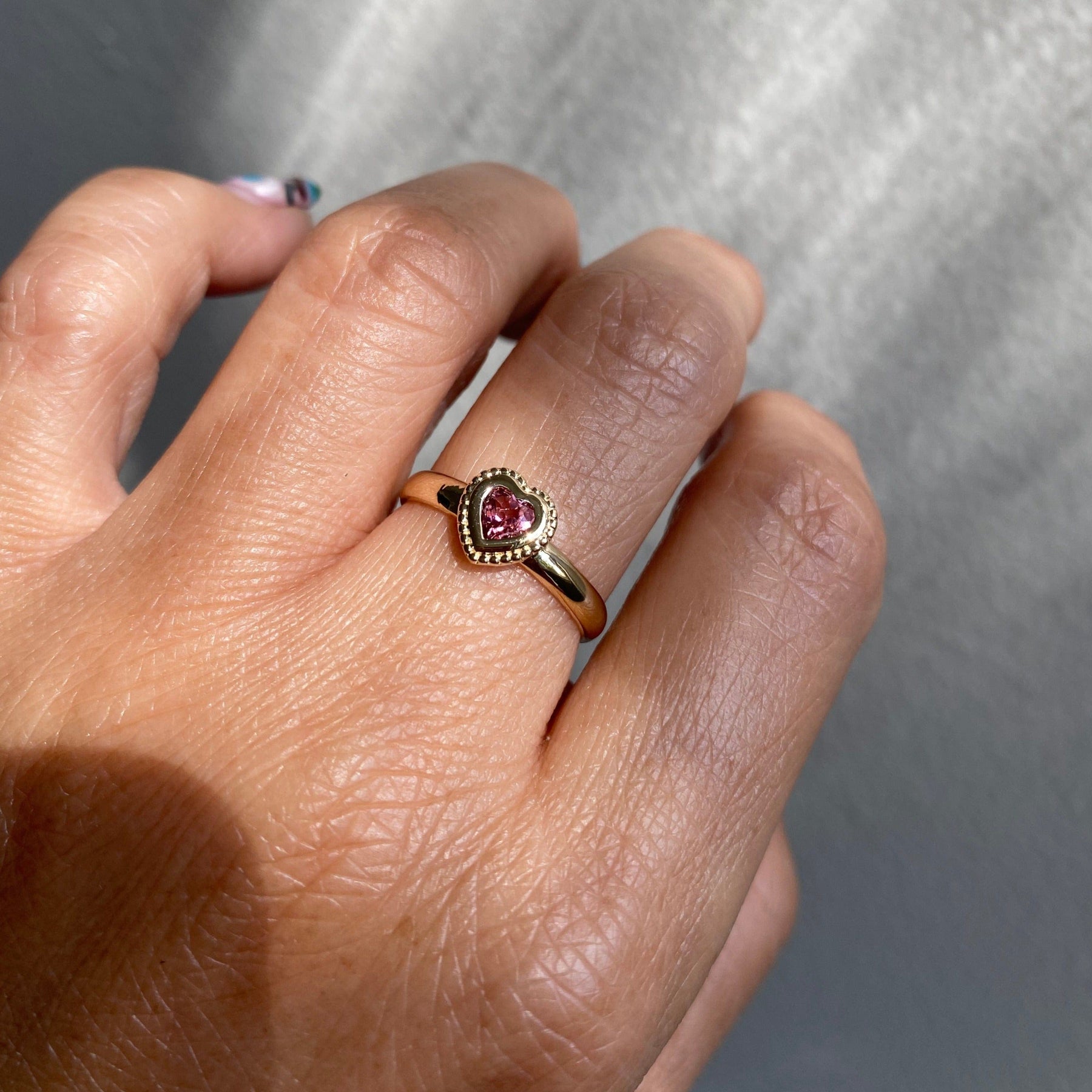 This handcrafted heart ring features a vivid pink tourmaline set in a richly textured bezel of solid 14k yellow gold. The softly sculpted heart frame and tri-bead detailing give the piece a vintage-inspired feel while remaining modern and wearable. Feminine yet bold, it is designed to be worn every day as a meaningful keepsake or signature stacking piece.