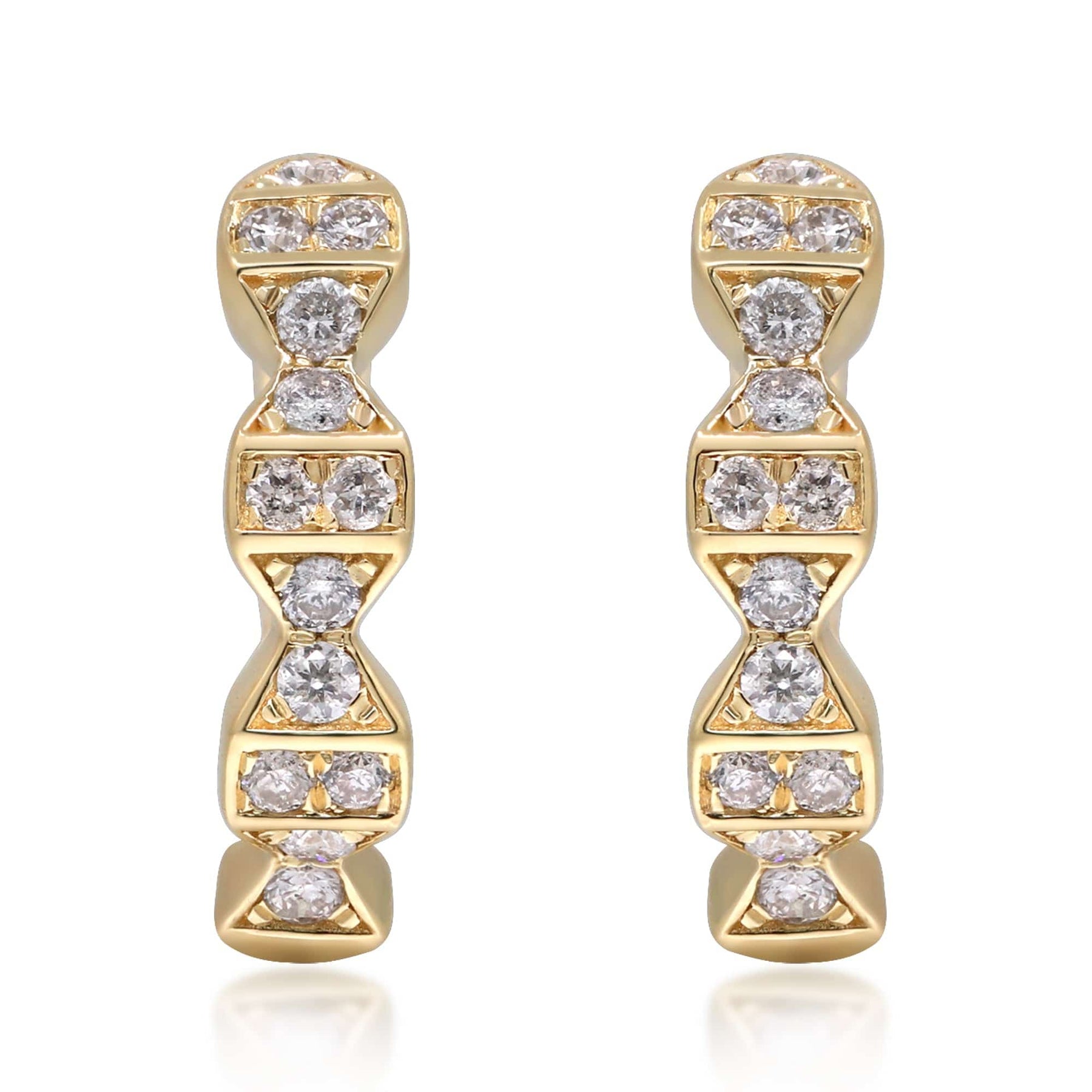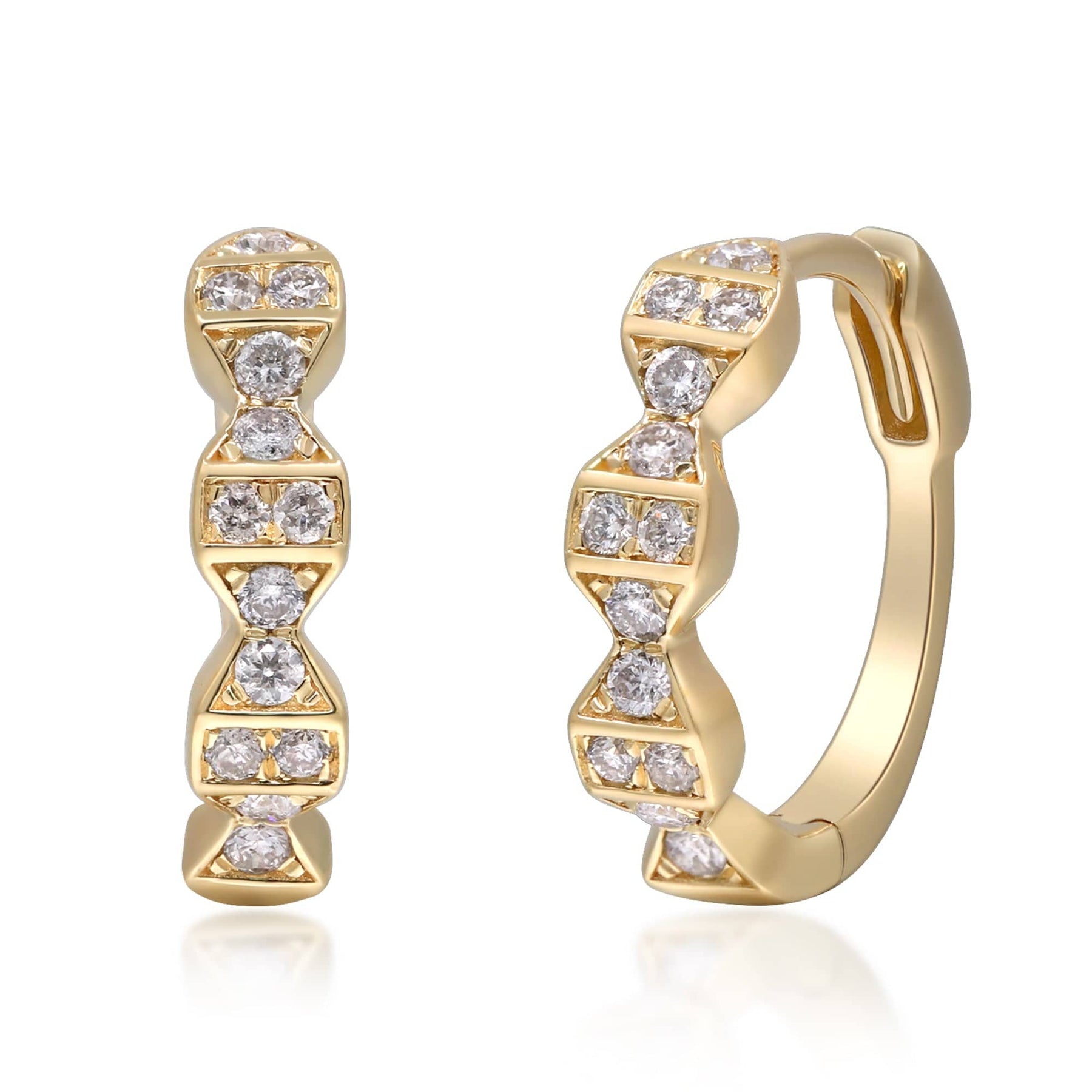 Modern yet timeless, these geometric diamond huggie hoops are crafted in polished 14K yellow gold and set with a structured row of brilliant natural diamonds. The geometric design creates a bold yet refined look, offering maximum sparkle in a sleek everyday silhouette. With a secure hinged closure, they’re comfortable enough for daily wear while making a statement worthy of any occasion.