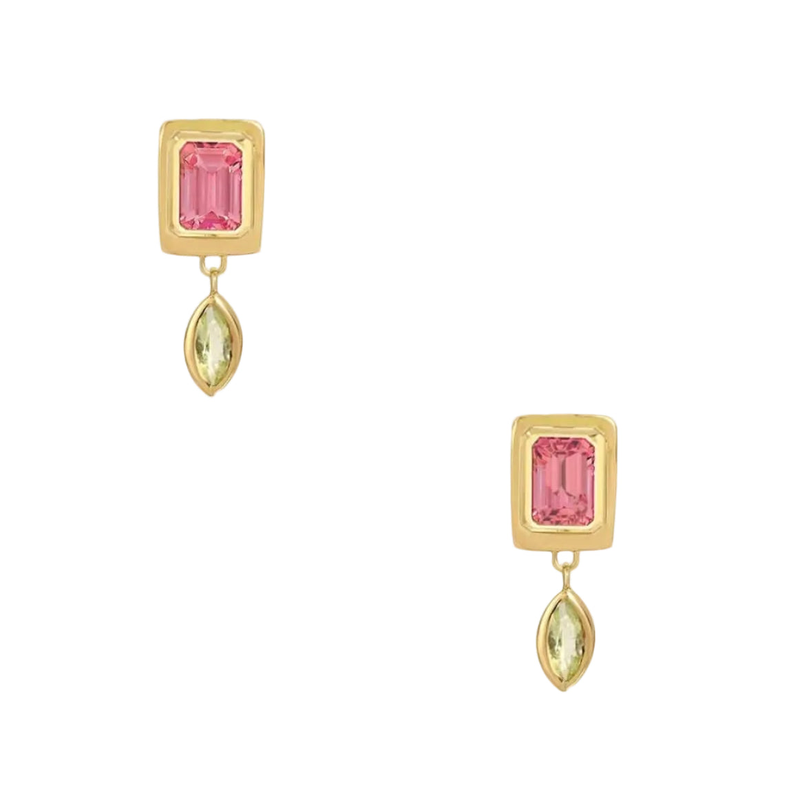 Dangling playfully, these whimsical earrings are elegant enough to be worn on their own and subtle enough to complement other pieces. Bright pink tourmalines draw the eye from their golden frames while two green tourmalines dangle below like droplets on a leaf. Hand‑crafted in Los Angeles, these earrings blend vibrant color with refined gold detailing.