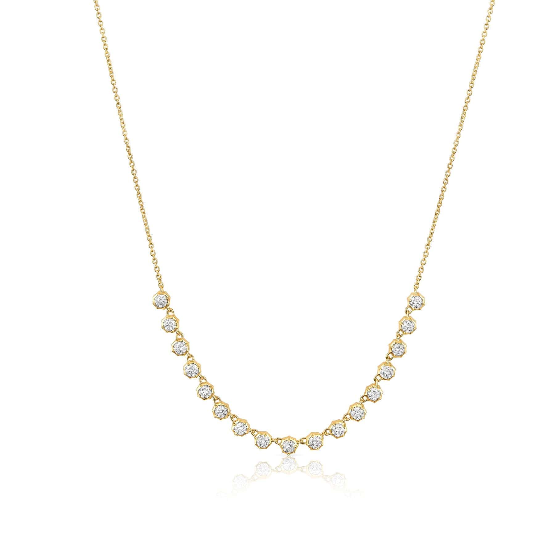 Sleek and luminous, this diamond bezel “fringe” necklace drapes refined sparkle along the neckline. Crafted in 14K yellow gold, the fluid silhouette blends modern edge with timeless polish and is striking solo, effortless to layer.